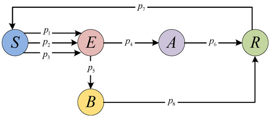 To build the SEBAR model, five individual states within the swarm system are defined as follows: Susceptible (S)—individuals that have not received the information; Exposed (E)—individuals that have received the information and have potential propagation ability; Backed (B)—individuals that support the current information and are actively spreading it; Against (A)—individuals that oppose the received information and are actively spreading their opposition; Recovered (R)—individuals that no longer receive or lose interest in the information. The transition relationships between these individual states are illustrated in Figure 1.