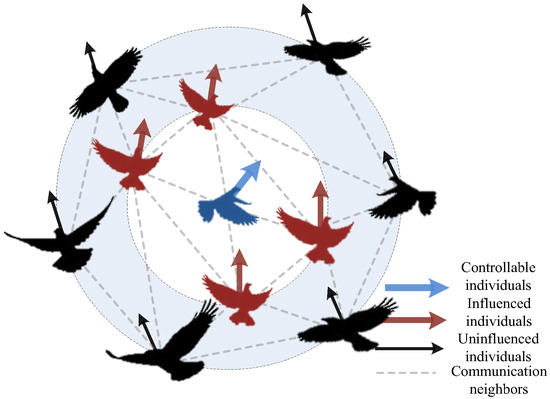 As shown in Figure 2, individuals in a bird flock are categorized into controllable individuals (marked in blue) and ordinary individuals (marked in red and black). Under the influence of individual interactive rules (dashed lines), ordinary individuals in red adjust their velocity and direction, and gradually align with the controllable individual in blue, while the velocity and direction of ordinary individuals in black, which are unaffected by the controllable individuals, remain unchanged. Through mutual influence, the direction of the ordinary individuals in black finally aligns with the controllable individuals. Thus, by controlling the behaviors of local individuals in the swarm, global behaviors can be guided toward the desired state.