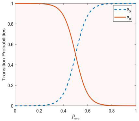 The introduction of controllable individuals can facilitate the emergence of cooperative behavior to some extent, thereby increasing the average payoff of the cooperative group. Additionally, the individual’s average single-game payoff is equal to the group’s average cooperation frequency. Therefore, in the context of information dissemination control, an association function between game payoffs and the transition probabilities of states is designed by analyzing the parameter influence of the SEBAR model. In cases of high game intensity and unfavorable information dissemination, the guidance of information propagation can be achieved by adjusting the state transition probabilities. The adjustment functions of and are designed (as shown in Figure 3) as follows: