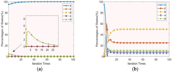 At the early stage of information propagation, all individuals in the network are in state S. After introducing individuals in state B or A at a certain moment, the average expected amount of information being transferred to other individuals is [27], and is the critical value determining whether the information can continuously spread within the network. When , the proportions of different states change over time until an equilibrium point. In contrast, when , the proportions of different states decrease over time and eventually disappear [28,29].