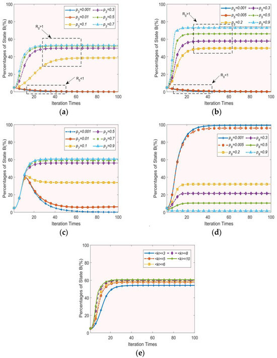 From the perspective of the network structure, affects the number of interactive neighbors. As can be seen in Figure 5e, the speed of information dissemination is accelerated with the increase in . However, when exceeds a certain threshold, the convergence rate gradually slows down. The final proportion of state B also increases with , but the degree of change is relatively small. Compared with other parameters, the impact of on the final proportion of individuals in state B is greater than that of .