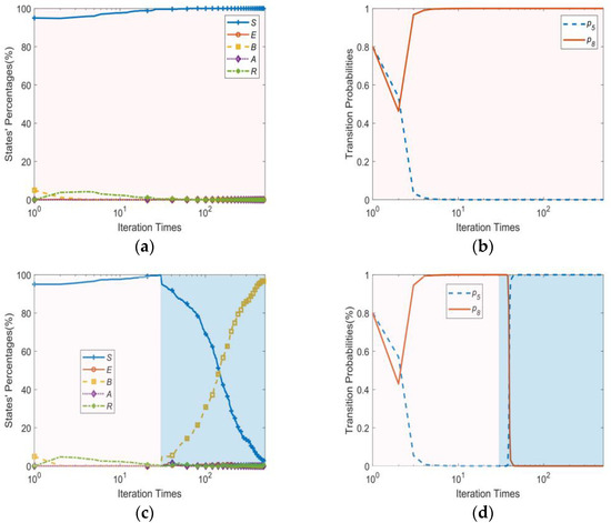 According to the basic reproduction number and Table 3, it is evident that the parameter does not affect the value of . Referring to Figure 5c, the larger is, the higher the proportion of the state B before the swarm system reaches equilibrium. Under the influence of the forgetting mechanism, a larger increases the possibility of the individuals in state R forgetting the received information, It also accelerates the state transfer from state R to state S. Therefore, on the condition of , the proportion of the state B can be increased through adjusting this parameter properly.