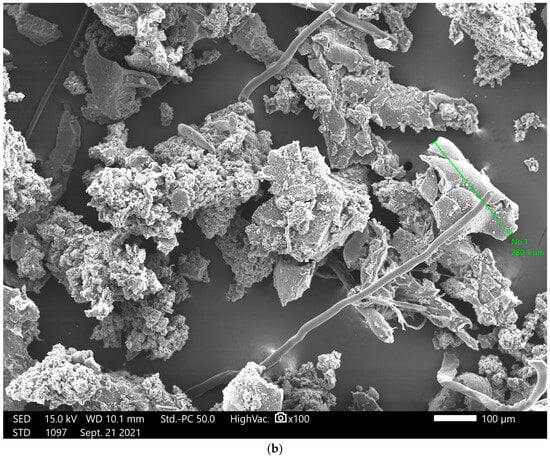 As a preliminary research programme, laboratory testing was carried out to investigate the properties monitored during the construction of a cement-bound base course (CBC) within a construction quality control programme. Firstly, the compaction characteristics were determined and analysed following the determination of mechanical properties, in line with a standard field test programme conducted on CBC (7- and 28-day compressive strength test and resistance to freezing and thawing). Within this research, CBC mixtures consisted of equal proportions of three gravel fractions and one fraction of river sand. They were stabilised with various amounts of cement (3%, 5%, and 7% by total aggregate mass) and various amounts of waste rubber (WR) (10%, 20%, 30%, and 40% by sand volume) as a fine fraction (sand) volume substitute. The natural aggregate included gravel and sand from the Sava and Drava rivers, respectively; Portland cement of grade 32.5R (CEM II B/M (P-S)) was used as a binder. The densities of the natural aggregates used (0–4 mm, 4–8 mm, 8–16 mm and sand) were 2.96, 2.63, 2.70, and 2.86 g/cm3, respectively; WR was 1.123 g/cm3, as determined by EN 1097-6:2013 [24]. The reference mixture comprised equal proportions of each natural aggregate fraction (25% mass each) with a volume substitution of sand by WR, as presented in Table 1, due to its similar grain size distributions (Figure 1). A Scanning Electron Microscopy (SEM) image (at a 100 times magnification) of sand and WR is presented in Figure 2.