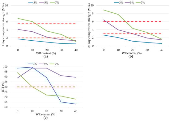 Mechanical characteristics: 7 days (a); 28 days (b); compressive strength and RTF (c); red lines present limit values.