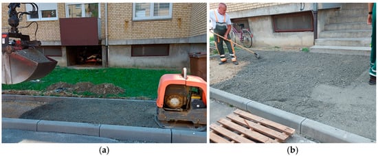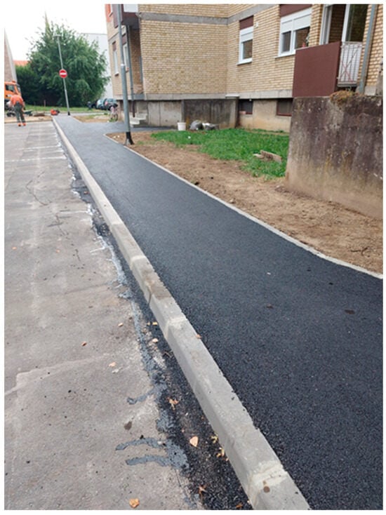 The mixture produced was delivered to the construction site to be used in the reconstruction of pedestrian paths in a residential area in the city of Osijek. The dimensions of the test field were 50.0 × 1.5 m. Due to the expectedly insignificant traffic load (pedestrian traffic), the pavement structure consisted of the following materials: