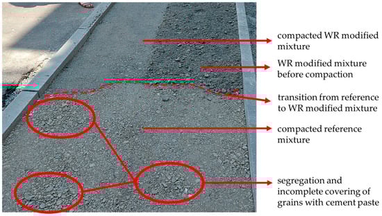 Better compaction of the WR-modified mixture was observed in the field, as well as easier compaction with vibro-compactors, compared to the reference mixture. A more uniform surface layer was also achieved, compared to the reference mixture, avoiding the generation of areas with pronounced segregation of the larger aggregate grains (Figure 6). These conclusions were confirmed in a discussion with the technical team in the field. The completed test section is shown in Figure 7.