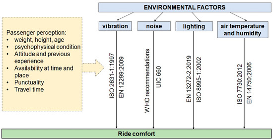 Passengers’ sensitivity to individual environmental stimuli varies. The perceived level of comfort is related to a second group of factors that relate directly to the individual. This group includes the gender, weight, age, and height of the passenger, their psycho-physical condition, their health status, and the position occupied. In addition, previous travel experiences and attitudes, the availability of the means of transport at the desired place and time, and punctuality are important [5]. All the above-mentioned factors result in different perceptions of ride comfort between passengers. Figure 1 presents the key factors of ride comfort.