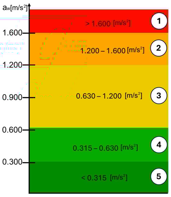 According to Table 1, five levels of vibration comfort have been established. Level 5 on the C1 scale indicates “comfortable” conditions and can be assigned when the index does not exceed 0.315 m/s2. Level 4 is assigned when the index falls within the range of 0.315 to 0.630 m/s2 and indicates “slightly uncomfortable” conditions. The subsequent levels are defined as follows: a rating of 3, corresponding to the range of 0.630 to 1.200 m/s2, indicates a “quite uncomfortable” ride; a rating of 2, within 1.200 to 1.600 m/s2, signifies “uncomfortable” conditions; and values exceeding 1.600 m/s2 are rated as 1, described as “very uncomfortable”.