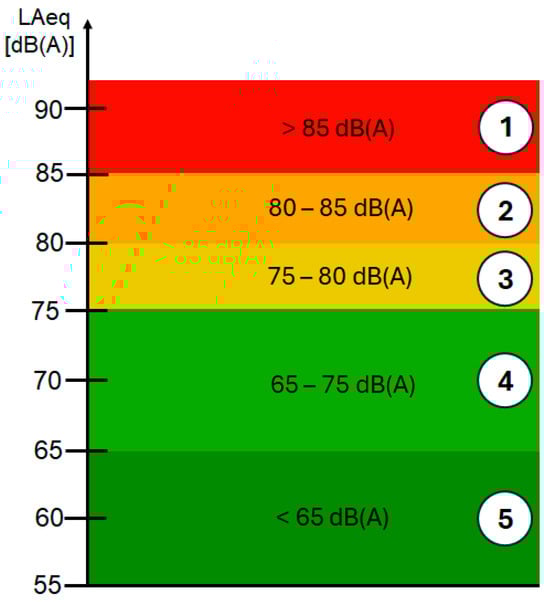 Due to the high sensitivity of the human ear to even a small increase in sound intensity, subsequent levels 2 and 3 on the comfort scale correspond to smaller ranges of sound level LAeq. Thus, level 3 on the acoustic comfort scale is assigned to results in the range of 70–80 dB(A) and indicates “quite uncomfortable” conditions. At level 2, the range is 80–85 dB(A), described as “uncomfortable,” and level 1 applies to values exceeding 85 dB(A), indicating “very uncomfortable” conditions.