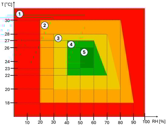 The Central Institute for Labour Protection—National Research Institute (CIOP), which is a state research institute in Poland, considers a temperature in the range of 23 °C to 26 °C to be optimal for thermal comfort in office spaces [40]. This range refers to conditions in which a person at rest is dressed in light clothing and the humidity is equal to 50%, while at the same time, the temperature of the walls and air is the same. It should be noted that the effect of humidity on thermal comfort, according to CIOP, is much greater at high temperatures. Higher humidity intensifies the thermal sensations, while too low humidity causes discomfort due to drying of the skin or mucous membranes. For optimal health conditions, a humidity of between 40% and 70% is recommended.