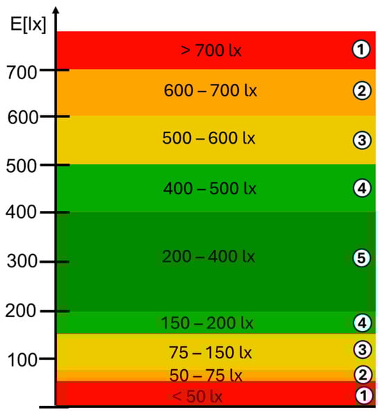 The proposed scale of visual comfort in terms of illuminance inside passenger compartments is based on the recommendations of the above-mentioned standards and institutions. The EN 13272-2:2019 standard recommends only minimum illuminance levels in carriages and is focused more on lighting quality than passenger comfort. No upper limit for illuminance is included in the standard. Its main objective is to provide comfortable lighting conditions for passengers who are engaged in visual work (reading, computer work) during the journey, but also for those who use the travel time for relaxation and rest. The authors propose that, due to the possible failure of luminaires and the varying perceptions and needs of passengers, further comfort levels should be limited for both minimum and maximum values. Although the ISO 9885-1:2002 standard refers to indoor workplaces, it recommends that a maximum illuminance level of 700 lx be considered as the limit for the comfort of any passenger. In addition, for reasons of passenger safety and health, a minimum illuminance level should be provided, particularly in emergency situations and during passenger exchanges. However, it cannot be assumed that the minimum values recommended for the above-mentioned reasons will also be appropriate in the context of ride comfort. Therefore, the range of all illuminance levels below the value of 200 lux, referred to as a minimum of level 5 (“comfortable”) in the proposed scale, is divided into four smaller ranges. These ranges correspond to decreasing visual comfort and the respective levels from 2 to 5 on the proposed scale. The authors adopt the larger ranges at illuminance values higher than 400 lux (the upper limit of level 5 of the scale) because there is no concern for passenger safety at such high illuminance levels. The proposed scale is shown in Figure 6.