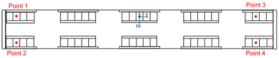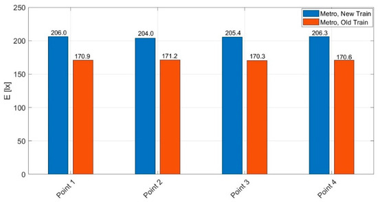 Figure 16 shows the results of the average illuminance values in the metro vehicles. In each vehicle, illuminance was measured at four measurement points. The measurement points were located at a height of 0.8 m from the floor near the passenger seats, with two in the front and two in the rear of the carriage (one on the left and one on the right side).