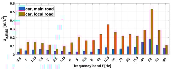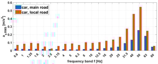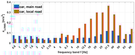For the assessment of vibration comfort, the proposed method adopts the recommendations of the ISO 2631-1 standard. The authors chose to use this standard because of its versatility and lack of restriction on the type of means of transport. The quoted document allows for the assessment of ride comfort on the basis of a weighted method. This method is based on the measurement of vibration accelerations propagating in three directions (x, y, z), which are defined in the standard depending on the position of the human body. The measured accelerations are used to determine the RMS values of vibration accelerations in one-third octave bands with frequencies in the range from 0.8 to 80 Hz. This range corresponds to humans’ sensitivity to mechanical vibrations. On the basis of the calculated values of the effective vibration accelerations, the weighted RMS values should be calculated separately for the x, y, and z directions according to the formula