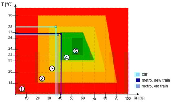 The new metro train in the Warsaw metro offers slightly better thermal conditions with an average temperature of 26.9 °C and relative humidity at 40.5%, corresponding to a comfort level of 4, close to the high end of the comfort scale from 1 to 5. Montreal’s newer metro cars also achieve a higher rating, 0.64, than older cars, but still fall into the “fair” category as defined in [30].