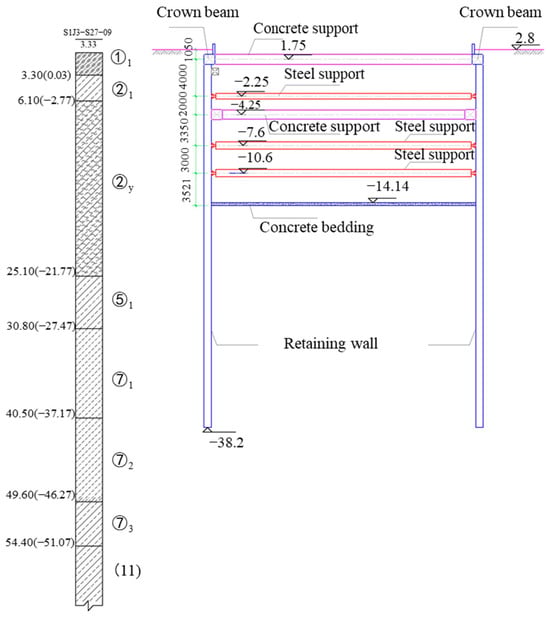 The excavation depth of the pit was large, the groundwater level was high, and the geological conditions were complex. The diaphragm wall had high stiffness and excellent impermeability characteristics, which can effectively control pit deformation, ground settlement, and cut off groundwater. The diaphragm wall and inner supports were selected as the foundation pit retaining structure and waterproof curtain. The standard excavation depth of the pit was 16.5–16.9 m, and the excavation depth of the end shaft was 18.4 m. A diaphragm wall with a thickness of 800 mm was adopted, whose insertion ratio was 1.16–1.48 and depth was 38.5–41.5 m, in accordance with the requirements of the Technical Specification for Retaining and Protection of Building Foundation Excavations (JGJ120-2012). To limit lateral deformation, five layers of supports were constructed, as described in Figure 1. The first and third supports were reinforced concrete with grade C35, while the others were steel supports. The cross-section of the first reinforced concrete support is 800 mm × 1000 mm, while the cross-section of the third reinforced concrete support is 1000 mm × 1000 mm. The fourth and fifth steel supports are φ800 mm (t = 20 mm) steel pipe supports, while all other supports are φ609 mm (t = 16 mm) steel pipe supports. The foundation employs φ850 @600 triple-axis mixing piles for soil reinforcement.