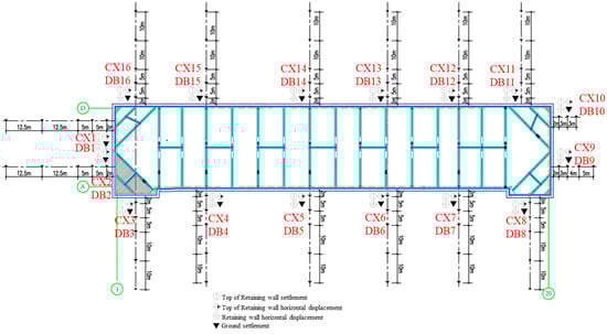 The plan layout of the monitoring points is shown in Figure 2. Monitoring was conducted with a frequency of once per day during all excavation stages. Six main sections were set up along the longitudinal direction of the foundation pit. The top of the diaphragm wall and the deep horizontal displacement monitoring points were set up, and surface settlement monitoring points were set up in the range of 2 times the depth of the excavation of the foundation pit, and the surface settlement monitoring points were gradually thinned out from the foundation pit to the outside. Typical monitoring sections were selected to analyze the horizontal displacement of the diaphragm wall and the surface settlement outside the pit in the end well on one side and the standard section of the pit, respectively. The specific monitoring instruments include the following: (1) the surface settlement (DB1-DB16) was investigated using the Leica LS15 Laser Scanner; (2) the diaphragm wall’s lateral displacement (CX1-CX16) was monitored using inclinometers; and (3) the support axial force was investigated using a portable frequency reader. All of these instruments were examined during the excavation to reduce measurement errors.