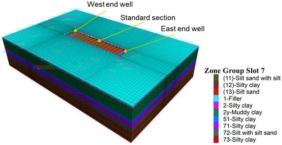 The software FLAC3D 6.0 was used to establish the model based on the engineering information. Considering the influence range of the excavation, the boundaries of the peripheral soil body and the depth boundary were set to no less than five times the depth of the pit excavation [,]. The final size of the model was determined to be 333 m × 180 m × 70 m (L × W × H), containing 1,033,950 nodes and 1,001,280 grid cells. The 3D modeling included the soil around the pit, the retaining structures, and the support structures (crown beam, concrete supports, steel supports), as shown in Figure 3. The model was divided vertically into ten layers, and the excavation was completed in seven stages along the longitudinal direction of the pit.