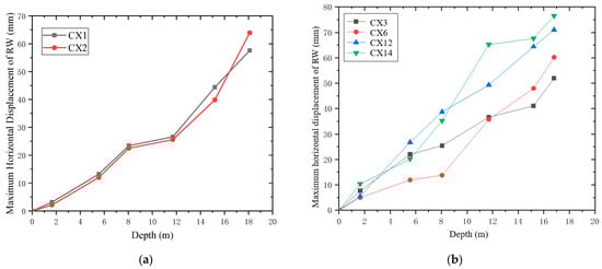 Variation rule of maximum horizontal displacement of enclosure wall: (a) maximum horizontal displacement of west end well wall; (b) maximum horizontal displacement of standard section wall. RW means retaining wall.