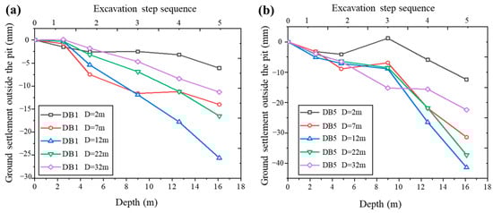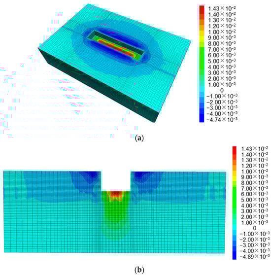 Vertical displacement after the completion of excavation: (a) surface settlement outside the pit; (b) vertical displacement.