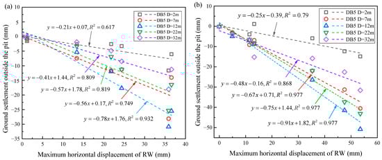 The surface settlement observed at various distances from the pit during the excavation of the pit is shown in Figure 6. According to on-site monitoring results, as the distance from the pit increased, the settlement outside the pit first increased and then decreased. As shown in Figure 6a, the surface settlement at the west end well increased almost linearly with excavation depth under the sequence of excavation stages, and the maximum surface settlement during excavation was 35 mm. The maximum surface settlement occurred at a distance of 12 m outside the pit, with a settlement rate of −1.9 mm/m per meter of excavation depth. After the excavation was completed, the deformation continued to increase until the base slab was poured, at which point the deformation began to converge and gradually stabilized. Similarly, the ground settlement in the standard section of the pit correlated positively with the depth of excavation and the sequence of excavation, with a sudden change in settlement occurring during the construction of the third steel support, followed by a trend of accelerated deformation over time. After the excavation was completed, the surface settlement continued to increase, reaching over 50 mm. The relationship between surface settlement outside the pit and the maximum horizontal displacement of the diaphragm wall, as shown in Figure 7, indicated a linear correlation. There was a significant correlation between the maximum surface settlement and the maximum horizontal displacement of the diaphragm wall, with an R2 value of 0.932 for the end well and 0.977 for the standard section. When the horizontal displacement of the diaphragm wall reached approximately 20–30 mm, the surface settlement outside the pit rapidly increased and even underwent abrupt changes, clearly linking ground settlement to the horizontal displacement of the diaphragm wall caused by excavation. These monitoring results indicated that excavation was the main factor causing surface settlement outside the pit, closely related to and controlled by the timing of the excavation. Besides the immediate deformation caused by excavation, the time-dependent deformation of mucky soil was also notably significant.