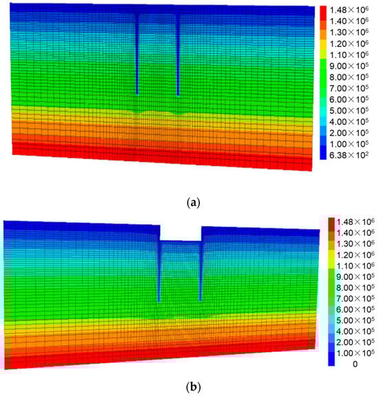 Before dewatering, the water levels inside and outside the pit were nearly equal, as shown in Figure 8a, with the diaphragm wall serving as a waterproof curtain. In the numerical model, the pore water pressure on the diaphragm wall was assumed to be 0 kPa, considering the impermeability of the wall and the dissipation of excess pore water pressure near the interface. Outside the diaphragm wall, the soil layer’s pore water pressure was consistent with initial equilibrium. During the phased dewatering and excavation of the pit, as shown in Figure 8b,c, under the influence of the seepage field within the pit, the water level inside gradually decreased, with groundwater around the pit seeping into the pit. Due to the deep insertion of the waterproof curtain and the primary focus on dewatering the shallow mucky soil layers, the vertical flow of groundwater in the mucky soil layers dominated, with more groundwater flowing from beneath the pit into the pit than from the outside to the inside laterally. Overall, dewatering has little impact on the water level outside the pit, but it significantly affected the water level at certain depths below the pit base, reducing it. Once the excavation was completed, the water level inside the pit dropped to about 1 m below the pit bottom, significantly lower than the water level outside, because it was cut off by the diaphragm wall. Dewatering was necessary to lower the water level below the excavation surface, ensuring dry excavation. The impact of dewatering on pit stability was considered, and water pressure was calculated in the design.