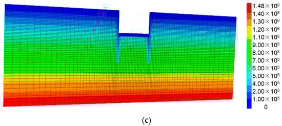 Pore water pressure contour with different construction steps: (a) before excavation; (b) excavation of third floors; (c) final excavation.