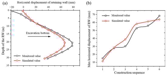 Based on the lateral displacement of the diaphragm walls, as shown in Figure 9, when excavating to the bottom slab, excavation caused the obvious deformation of the retaining structure. The last excavation had no support at the bottom, and the support stiffness above the excavation face was large, which led to the horizontal deformation developing downward, causing large deformation, and the maximum deformation position was shifted downward []. From the point of maximum lateral displacement, the lateral displacement of the diaphragm walls gradually decreased both upward and downward. To analyze the rationality of the parameters used in this simulation, the simulated horizontal displacement of the diaphragm walls was compared with the on-site monitoring data, as shown in Figure 10. Figure 10a shows that the lateral displacement of the diaphragm walls increased and then decreased along the depth, with the maximum lateral displacement occurring about 5 m below the base slab of the pit, with both simulated and monitored lateral displacements exceeding 60 mm. The simulation data fitted well with the monitoring data, with a maximum difference of about 5 mm, accurately reflecting the lateral deformation pattern of the diaphragm walls. Figure 10b indicates that both the simulation and monitoring data reflected the deformation pattern of the diaphragm walls’ lateral horizontal displacement increasing with the progress of excavation and the extension of construction time. This was because when excavation was shallow, the pressure difference between the soil inside and outside the wall was very small, leading to minimal changes in lateral displacement. As the depth of excavation increased, the pressure difference also increased, leading to the greater lateral displacement of the walls. Additionally, the excavation range was permeated with flow plastic mucky soil, causing the deformation values to increase and develop over time, with the numerical simulation also considering the rheological characteristics of soft soil. The simulation data and monitoring data generally matched well. However, during the base slab pouring process, the monitoring data show the continued lateral deformation of the diaphragm walls, whereas the simulation data show the lateral displacement beginning to converge. This discrepancy may be due to the presence of large machinery around the site during the actual base slab pouring, which was not considered in the simulation.
