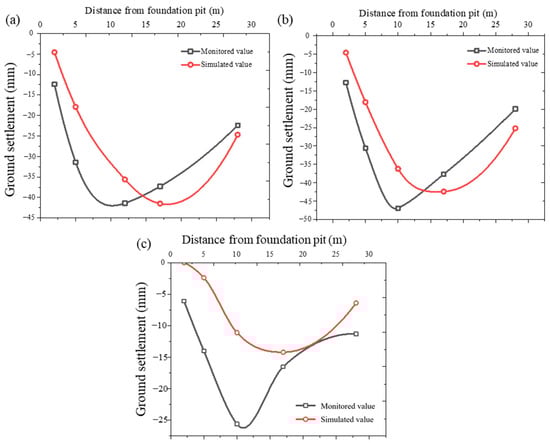 Based on the vertical deformation of the soil around the pit (Figure 11), it was evident that after the completion of pit excavation, varying degrees of settlement occurred on the surface outside the pit. The surface settlement on both sides of the pit was symmetrical, increasing with distance from the pit edge before decreasing. Settlement on the shorter sides was less than that on the longer sides. Through the selection of monitoring points along the pit section, the comparison between monitored surface settlement data and simulation results, shown in Figure 12, revealed that the simulated surface settlement followed a similar pattern to the monitoring data, initially increasing and then decreasing from the edge of the pit, forming a “concave”-shaped curve, with the maximum settlement point moving away from the pit edge line. The surface settlement reached its maximum at about 12 m from the pit edge, which differs from the commonly observed pattern, where maximum settlement typically occurs at a distance of approximately 0.2 to 0.3 times the excavation depth [,,,]. This discrepancy may be attributed to the creep behavior and high compressibility of the soft soil, which allowed for the settlement to extend further from the pit edge, especially when the excavation depth was significant. This aligns with findings in studies by Ge et al. (2025) and Tanoli et al. (2022), where maximum settlement in soft soils was observed farther from the excavation boundary [,]. After fluid–solid coupling and rheological calculations of the mucky soil, the overall simulation results for the pit’s standard section aligned closely with the on-site monitoring results, with the maximum difference in deformation at the points of the greatest surface settlement not exceeding 5 mm. In the simulation, only the effects of overload were considered, while live loads such as construction vehicles were not taken into account. Relevant studies have shown that live loads, such as those from construction vehicles, can significantly impact surface settlement [,]. The simulation results for the end wells were smaller in scope than the monitoring data, which may be attributed to the frequent movement of heavy construction vehicles and public vehicles near the end wells at the actual construction site, leading to excessive surface settlement. Therefore, to protect the surrounding environment during actual construction, the monitoring of surface settlement at each excavation stage should not be neglected, especially at locations where the maximum values of surface settlement may occur during various stages.