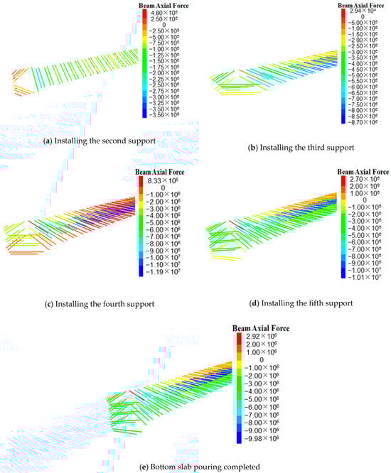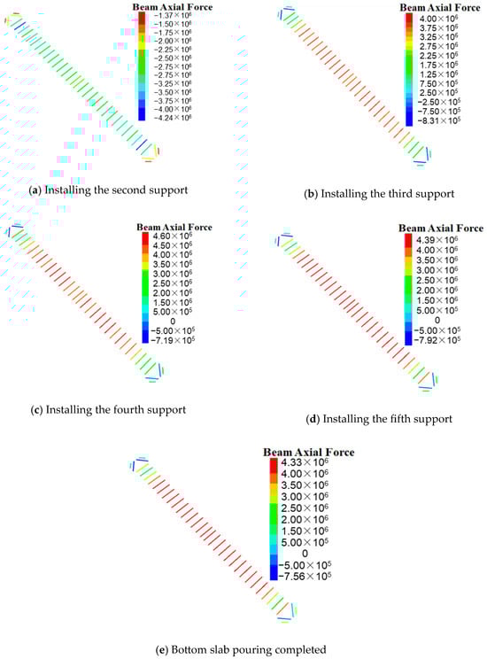 From the initiation of the second steel support to the completion of the pit base slab, the axial force changes in the first and third (concrete supports) and second, fourth, and fifth (steel supports) supports are shown in Figure 13 and Figure 14. Regarding the first support within the pit plane, it was under pressure when the second support was installed, and during the installation of the third support to the completion of the base slab, except for the end well supports, which were under pressure, the standard section supports were under tension. The axial force of the end well supports was less than that of the standard section supports, primarily due to the three-dimensional effects of the excavation and additional corner bracing. The spatial effect resulted in stronger lateral constraints at the end wells, reducing horizontal displacement and consequently lowering the axial force. Additionally, extra corner bracing was implemented at the end wells, further restricting deformation and distributing the loads more effectively, leading to reduced axial forces in the end well supports. The support axial forces continuously increased until the fourth support was installed. After the installation of the fifth support, the axial forces decreased until the base slab was completed, where they still showed a reduction.