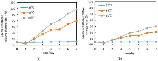 Figure 2 shows the relative variations in square resistance of the PET–AgNW and PVA–AgNW electrodes with time under different temperatures treatments, which characterizes the thermal stability of these two kinds of electrodes. The AgNW surface densities for both PET–AgNW and PVA–AgNW electrodes are 95 mg/m2. It can be seen that both the PET–AgNW and PVA–AgNW electrodes are stable at a room temperature of 25 °C, as the square resistance of both electrodes remains unchanged with time. However, when the ambient temperature is 65 °C, the resistances of the two kinds of electrodes change significantly with time, and their trends of change are consistent. The resistance of the electrodes first decreases slightly with time, showing that the conductivity of the electrodes improves slightly within 24 h, and then the resistance starts to increase rapidly with time. The reason for the initial decrease may be that the small amounts of water, acetone, isopropanol, and anhydrous ethanol left on the electrodes would evaporate at high temperatures, which increases the conductivity of the electrodes. With the increased time at high temperatures, the oxygen and moisture present in the environmental air would react with the silver nanowires and generate non-conductive oxides and sulfides on the surfaces of the nanowires, which decreases the electrical conductivity of the AgNW electrodes []. After 7 × 24 consecutive hours at 65 °C, the change in square resistance of the PET–AgNW electrodes is close to 70%, which is more than twice the change in square resistance of the PVA–AgNW electrodes of 32.3%. When the ambient temperature increases to 80 °C, the changes in the resistance rate become greater. In our experiments, it was found that the AgNW electrodes behaved in a stable way when the ambient temperature was not higher than 40 °C. However, we have not made further experiments to clarify whether there is a critical temperature to trigger the degradation of AgNW electrodes significantly. It is noted that in Figure 2 the increase rates in the resistances of both PET–AgNW and PVA–AgNW electrodes with time are not constant when the ambient temperature is 65 °C or 80 °C. Considering the standard deviation of the relative change in resistance in our experimental system is 0.2%, and the change in resistance increase rates is more than 1%, we think the change in resistance increase rates does not originate from the measurement errors, but is the result of the changes in surface state of AgNWs with time.