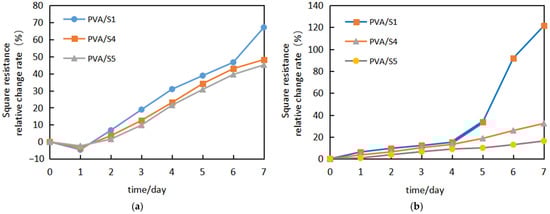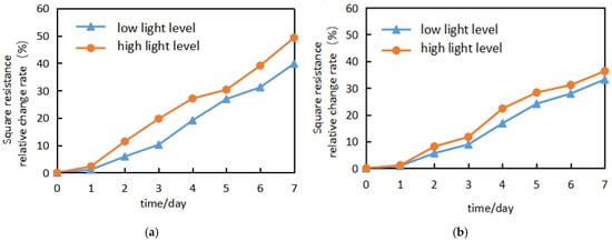 We prepared PVA–AgNW electrodes with silver nanowire surface densities of 64 mg/m2 (S1), 95 mg/m2 (S4), and 126 mg/m2 (S5) and their thermal stabilities and light stabilities were tested and compared and are shown in Figure 7. It was found from Figure 7a that the resistance variations of the three types of electrodes have the same trend: resistance firstly decreases with time and after dropping down to a certain value the resistance starts to increase rapidly with time. This is in line with the behavior of the thermal stability of AgNW electrodes we observed above. It is noted that the resistance change rates differed greatly for the three types of electrodes. With the increase in surface density of silver nanowires, the change rate of electrode resistance decreases. The change rates of resistance for silver nanowire surface densities of 64 mg/m2, 95 mg/m2, and 126 mg/m2 were 67.1%, 48.2%, and 45.1%, respectively. Figure 7b shows the resistance variations for three types of electrodes under high light power irradiation (optical power densities of 25.8 W/m2 to 27.0 W/m2 at 25 °C). It can be seen that the AgNW electrodes with different surface densities exhibit different light stabilities: after 7 × 24 consecutive hours, the change rates of the square resistance for silver nanowire surface densities of 64 mg/m2, 95 mg/m2, and 126 mg/m2 were 121.3%, 32.3%, and 16.2%, respectively, which indicates that the light stability of the electrodes improves with the increase in the silver nanowire surface density.