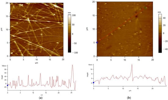 AFM images of the surfaces of AgNW electrodes with 95 mg/m2 of AgNW surface density at an ambient temperature of 25 °C. (a) PET–AgNWs, and (b) PVA–AgNWs.