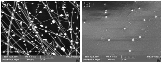 To explore the reason for GO enhancing the stability of the electrodes, electron microscope scans were performed on the PET–AgNW electrodes and PET–AgNW–GO electrodes each after continuous 7 × 24 h of heat treatment at 80 °C, and the SEM results are shown in Figure 11. It was found that there are amounts of nanoparticles on the PET–AgNW surfaces without GO surface treatment (as shown in Figure 11a), while the nanoparticles on the surfaces of the PET–AgNWs with GO are hard to be identified for the encapsulation of GO (as shown in Figure 11b). This indicates that the covering of silver nanowires and the contact intersections with GO can block the oxygen and water in the environment and prohibit the generation of silver nanoparticles. It should also be noted that the surface modification of GO cannot completely prevent the degradation behaviors because the GO modified by solution does not uniformly and densely cover the surface of all the silver nanowires. In fact, there are still parts of the silver nanowires that are not covered and protected by GO. Therefore, it is expected that the stability of AgNW electrodes can be further improved if the coverage of GO on the surface of AgNW electrodes, as well as the denseness, can be improved subsequently, such as by using atomic deposition for the surface coverage of GO film layers.