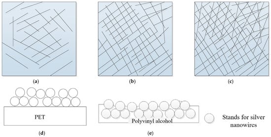 Schematic diagram of the distributions of silver nanowires on electrodes. Top view: (a) low surface density; (b) medium surface density; and (c) high surface density. Side view: (d) PET–AgNWs with medium surface density and (e) PVA–AgNWs with medium surface density.