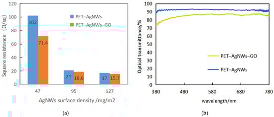 For AgNW electrodes, the firmness of the connection junctions between nanowires has an important influence on the electrical properties and stability of the electrode. Under physical pressure, the connection between silver nanowires mainly relies on van der Waals forces, which are easily affected by external temperature and light. If the connections of silver nanowires can be combined with certain chemical bonds, this is expected to improve the stability of the electrodes. For this reason, graphene oxide (GO) was used to modify the silver nanowire electrodes in the electrode preparation process. Since GO has good hydrophilicity, it can easily cover the silver nanowire cross junctions and parts of the silver nanowires, which enhances the junction connection force through its large Π-bonding and reduces the contact resistance between the silver nanowires and wires. The electrical and optical properties of the PET–AgNW electrodes before and after GO modification are shown in Figure 9. It can be seen that the GO layer improves the electrical properties of the electrodes, and the conductivity of the electrodes is improved more obviously when the surface densities of AgNWs are small. The coverage of GO on the AgNW electrodes also has a certain effect on the light transmittance of the electrodes. The average transmittance in the visible range of PET–AgNWs/GO is 85.02%, which is lower than the one of PET–AgNWs (92.24%). Assuming that the transmittance decreases by about 2.75% for each additional mono-atomic layer of GO, it can be estimated that the coverage thickness of GO is about two–three atomic layers according to the decrease in optical transmittance before and after GO coverage.
