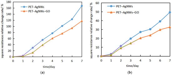 The thermal stability of GO-modified AgNW electrodes at 80 °C and the light stability under high optical power density (25.8~27.0 W/m2) were investigated and the experimental results are shown in Figure 10. The silver nanowire surface densities were set at 126 mg/m2. It was found that the thermal and light stabilities of the AgNW electrodes are improved after GO surface modification. After 7 × 24 h at 80 °C, the change rates of the square resistance of the PET–AgNWs and GO-modified PET–AgNW–GO electrodes are 98% and 69.4%, respectively, and the degradation rate of the electrical resistance is reduced by about 29% after GO treatment. After 7 × 24 h of high-power illumination, the change rates of the square resistance of PET–AgNWs and PET–AgNW–GO electrodes are 49.3% and 32.7%, respectively, and the degradation rate of the resistance is reduced by about 33% after GO treatment.