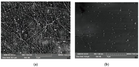 Figure 6 shows the SEM images of the surfaces of these two electrodes after 7 × 24 h of illumination at high optical power density. Figure 6 reveals that many nanoparticles are generated on the surfaces of the PET–AgNW electrodes, whereas nanoparticles are fewer on the PVA–AgNW electrodes. Most of the nanoparticles on the AgNW surfaces are silver oxides [,] and sulfides originating from the chemical reaction between AgNWs and the oxygen and moisture in the environment. It is also noticed from Figure 6a that, besides nanoparticles, there exist breakages of silver nanowires on the surfaces of PET–AgNW electrodes, which indicate that light exposure can not only cause chemical reactions on the surface of silver nanowires, but also cause physical damage to the silver nanowires and further accelerate the deterioration of the AgNW electrodes. According to the literature on the effect of light on the stability of AgNW electrodes [,,], light irradiation on AgNW electrodes will cause a redox process, including oxidation of silver nanoparticles, migration of silver ions, and reduction of silver ions to new silver nanoparticles at other locations, which will cause the silver nanowires to granulate and the conductive pathway be destroyed. For the PVA–AgNW electrodes, due to the wrapping effect of the PVA film on the silver nanowires, the damage caused by light illumination to the silver nanowire network connection can be effectively prevented, resulting in fewer broken wires on the electrode surfaces. Therefore, the use of the PVA substrates has a great contribution to the reduction in the surface activity of AgNW electrodes due to the wrapping effect and can improve the stability of AgNW electrodes greatly. Therefore, to further improve the stability of the AgNW-based electrodes, a protective layer should cover the exposed AgNW surfaces in the application process.