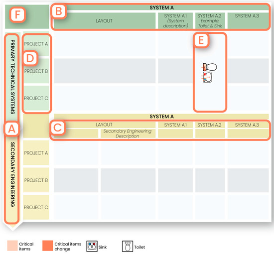 (B) Along the horizontal axis, the mapping highlights the primary systems and sub-systems that make up the product. The sub-systems highlight the functions comprising the primary system. The segmentation of systems should be such that different functions, technological areas, or organisational sections are separated where possible. The main systems are divided into smaller sub-systems to handle the high complexity, as pointed out in the Theory of Technical Systems [53]. It allows for comparisons of the sub-systems across different projects for both halves of the matrix. In addition to sub-systems, the system layout should be represented to show the relative positioning of the systems, indicating the various interfaces and interactions between those, thus revealing critical cross-functional dependencies across primary sub-systems, which is a key part of defining an architecture [6]. The first system to map should be determined in collaboration with company stakeholders, as they possess key knowledge of which systems have a high impact on the cost and lead time.