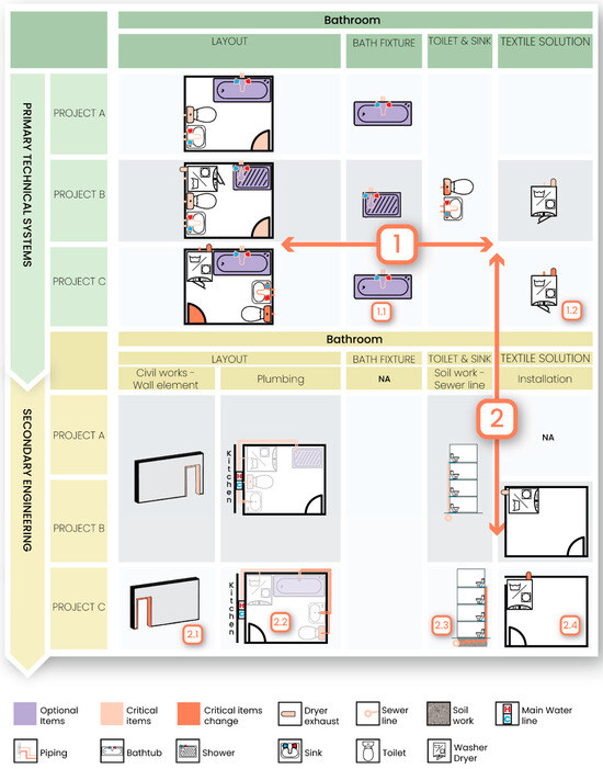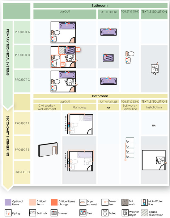 As depicted in Figure 2, three of the latest delivered bathroom projects were chosen for the analysis. The business-critical systems mapped in this example consist of a bath fixture, a toilet and sink combo, and a textile care solution. The company offers two bath fixtures: either a bathtub or a shower cabin. The designers require the toilet and sink to be placed next to each other as pairs. Although the company offers only one type of toilet, the sink comes in a square and a rounded variant. This is not included in the mapping, as the variance does not impact the on-site construction phase. Similarly, the floor tiles come in different colours, and cabinets of different sizes are mounted on the wall, but neither has an impact on the business-critical systems or secondary engineering. Lastly, textile care is included, as the company has recently decided to offer a combined washer/dryer unit, which they have not offered in previous projects.