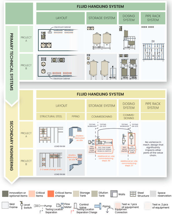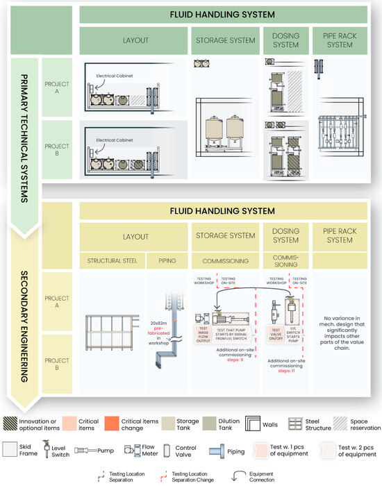 (E) The appropriate mapping of individual cells is critical in allowing for the successful analysis of the variation between projects. The mapping shall visualise the individual principles or designs that are employed to achieve the given sub-system, process, or layout in the respective projects. The visualisations representing the designs or principles shall have an abstraction level that highlights the design features whose variance impacts across competence areas or secondary engineering. In practice, this abstraction level is determined iteratively with stakeholders. This illustrative modelling is key to establishing a common ground from which stakeholders across the value chain and functional areas can understand and discuss the different technical systems and engineering processes [23]. The case study presented in Section 4.2 will provide an example of a sufficient abstraction level.
