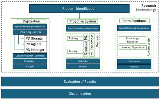 - Division of challenges: Starting from the idea of divisions mentioned earlier, we will define the challenges to address and the specific steps for each one. For this research, the following challenges have been identified: (i) digitization and manufacturing process representation, (ii) creation of a proactive system based on predictions, and (iii) retro-feedback for controlling and adjusting the manufacturing parameters. For each of them, the following sub-phases will be performed: