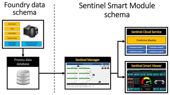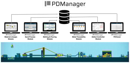 To carry out this data gathering process, the Production Data Manager tool, PDManager, developed by the Azterlan Research Center is used (for more information, please visit https://www.azterlan.es/en/kh/pdmanager, accessed on 20 January 2025). Specifically, PDManager is a real-time production control system designed to guarantee digitization, traceability, and the orderly storage of key parameters in a centralized database for the manufacturing process of cast components.