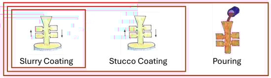 Investment casting process division and grouping for predictions and optimizations. First group, with the slurry coating work (). Then, as second group, the combination of both coating stages, slurry, and stucco (). Finally, the complete group including previous coating stages and the pouring ().