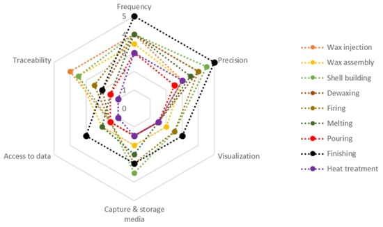 - KPI analysis: Once the interests and possibilities were listed, we developed an analysis addressing all key stages of the process. To achieve this, six different variables were compared using the Likert scale [] and combined in a Star Plot. The variables used are: (i) frequency, (ii) accuracy of the available information, (iii) visualization or its necessity, (iv) capture and storage media, (v) possibility of data access, and (vi) traceability.