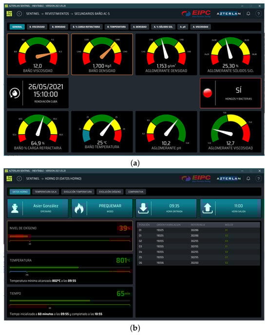 In a effort to combine this communication and data distribution technologies, Azterlan developed Sentinel (for more information about Sentinel, please visit https://www.azterlan.es/en/kh/sentinel-predictive-control, accessed on 20 January 2025). It is an integral system for data distribution and process monitoring, as well as anomaly detection, digital representations of the process, alert communication, and a tool for incorporating and utilizing different Artificial Intelligence (AI) models. Despite all the features available in the Sentinel system (illustrated in Figure 3), at this stage of development, Sentinel is focused solely on distributing, displaying, and presenting the gathered information. Hence, for now, we define Sentinel as a software system for automated and real-time data distribution. Sentinel displays key information and alerts to the people and locations where they are most useful. It allows for the deployment of dashboards or control panels designed according to user needs. These control panels can be implemented as static displays (on-site) or with navigation capabilities across different levels of information depth (e.g., process managers, laboratory, quality department, maintenance, and management, among others).