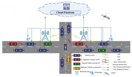 Vehicular ad hoc networks (VANETs) aim to enhance traffic management and minimize road accidents by offering various safety applications [12]. VANETs include connected vehicles, natural vehicles, Roadside Units (RSUs), Global Navigation Satellite Systems (GNSS), and cloud platforms. In a vehicle network, vehicular communications comprise Vehicle-to-Vehicle (V2V), Vehicle-to-Infrastructure (V2I), Vehicle-to-Pedestrian (V2P), and Vehicle-to-Network (V2N) communications, collectively referred to as Vehicle-to-Everything (V2X) communications [13], as Figure 1 shown.