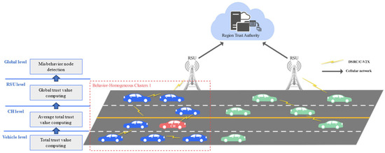 Our trust assessment model is structured around two topological layers: intra-cluster topology and inter-cluster topology. The inter-cluster topology utilizes centralized trust management methods through RSUs and global cloud controllers, while the intra-cluster topology employs distributed trust management methods. The hierarchical trust assessment model conducts layered composite trust value assessments through dynamic vehicle nodes, cluster head layers, and RSU layers. Finally, anomalous vehicles are identified at the cloud layer based on the composite trust values. The detection model is depicted in Figure 2, where vehicles of the same color belong to the same cluster, and the red vehicle serves as the cluster head.