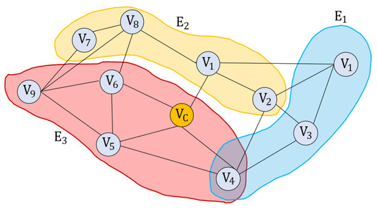 To address the multidimensional, dynamic, and complex interaction relationships between vehicle nodes, the hypergraph model is employed to represent the connections between pairs of vehicle nodes and hyperedges [23,24]. A hyperedge can connect any number of nodes, and a node can appear in multiple hyperedges, as shown in Figure 4, where different colors represent different vehicle clusters.