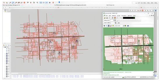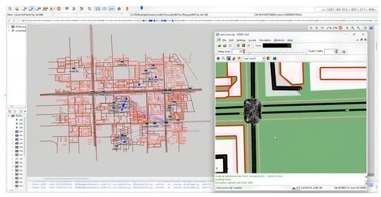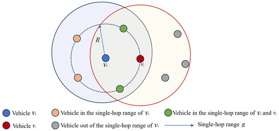 Assuming that and each vehicle operates for 15 min at random speeds in simulated traffic volumes of 0.05, 0.10, 0.15, 0.20, and 0.25, there are 100, 200, 300, 400, and 500 circulating vehicles in each of these five traffic environments. Vehicle densities of 0.05, 0.15, and 0.25 are defined as low-, medium-, and high-density, respectively. In the simulation, all vehicles are equipped with DSRC for V2V or V2I communication and operate in broadcast mode within a communication transmission range of 100 m, as shown in Figure 8.