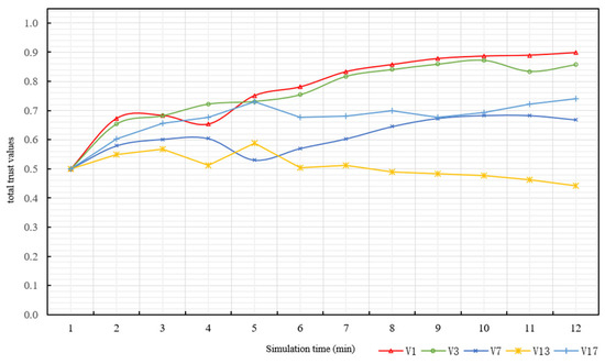 The trust value calculation method proposed in this study is tested in a simulation by evaluating vehicle behavior based on speed, node distance, and transmission rate. The total trust values of circulating vehicles in the simulation scenario are monitored and tracked, with Figure 9 showing the changes in total trust values for five vehicles , , , , .
